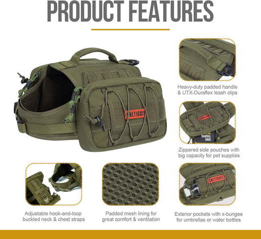 Dog Backpack for Medium & Large Dogs, Nylon Backpack for Dogs Tactical Pet Backpack with Side Pockets for Hiking Walking Training Running (Green, Large)