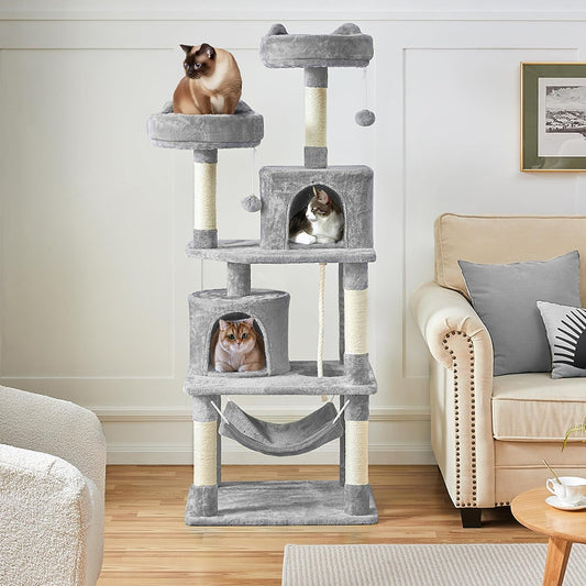 62.5Inches Cat Tree Cat Tower Cat Condo with Platform & Hammock, Scratching Posts for Kittens Pet Play House with Plush Perch for Indoor Activity Relaxing, Light Gray